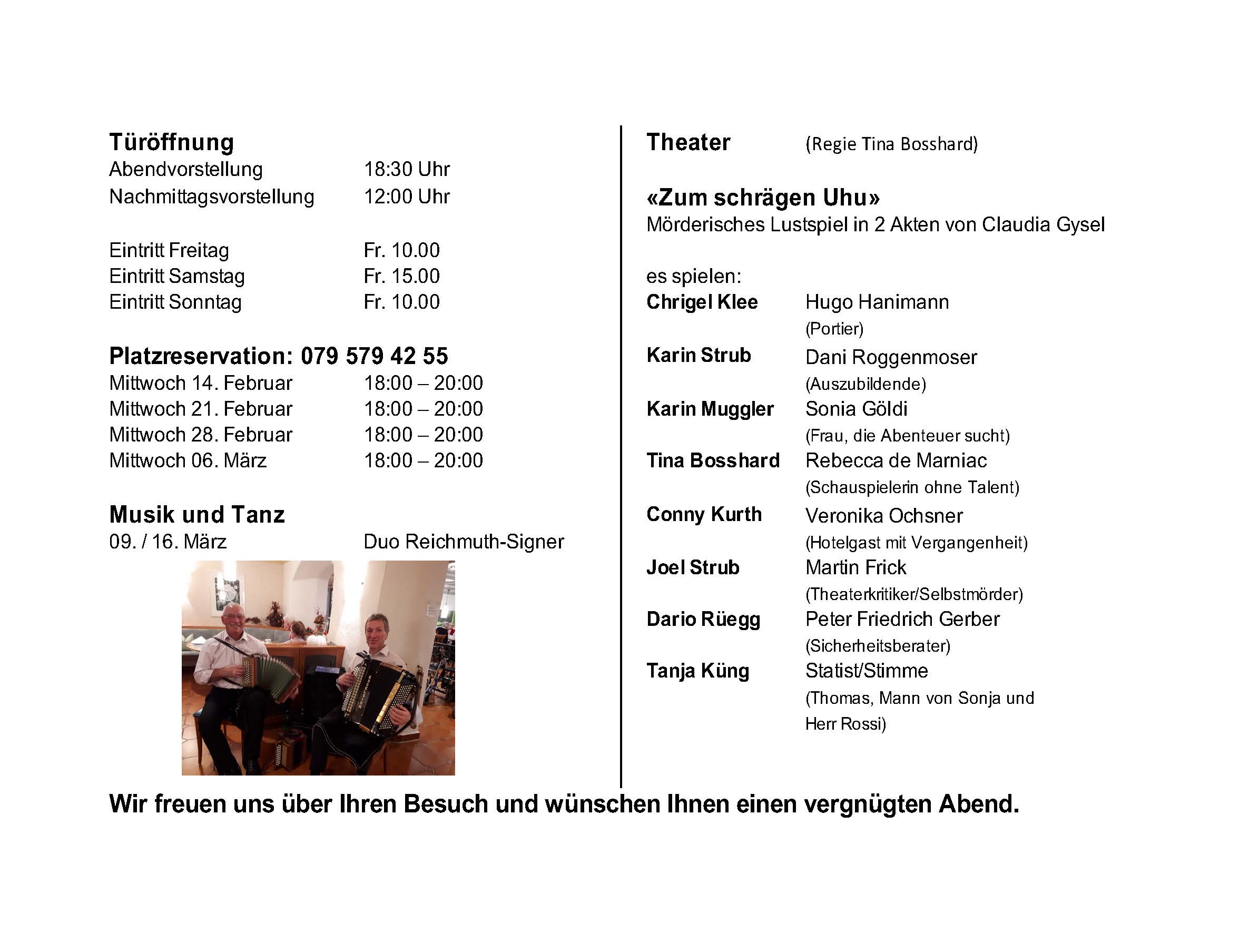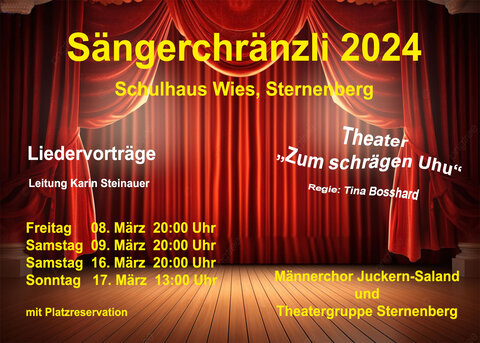 Zusammen mit der Theatergruppe Sternenberg haben wir im Schulhaus Wies, Sternenberg, vier Vorstellungen durchgeführt. An den beiden Samstagen spielte im Anschluss jeweils das Duo Reichmuth-Signer zum Tanz auf.